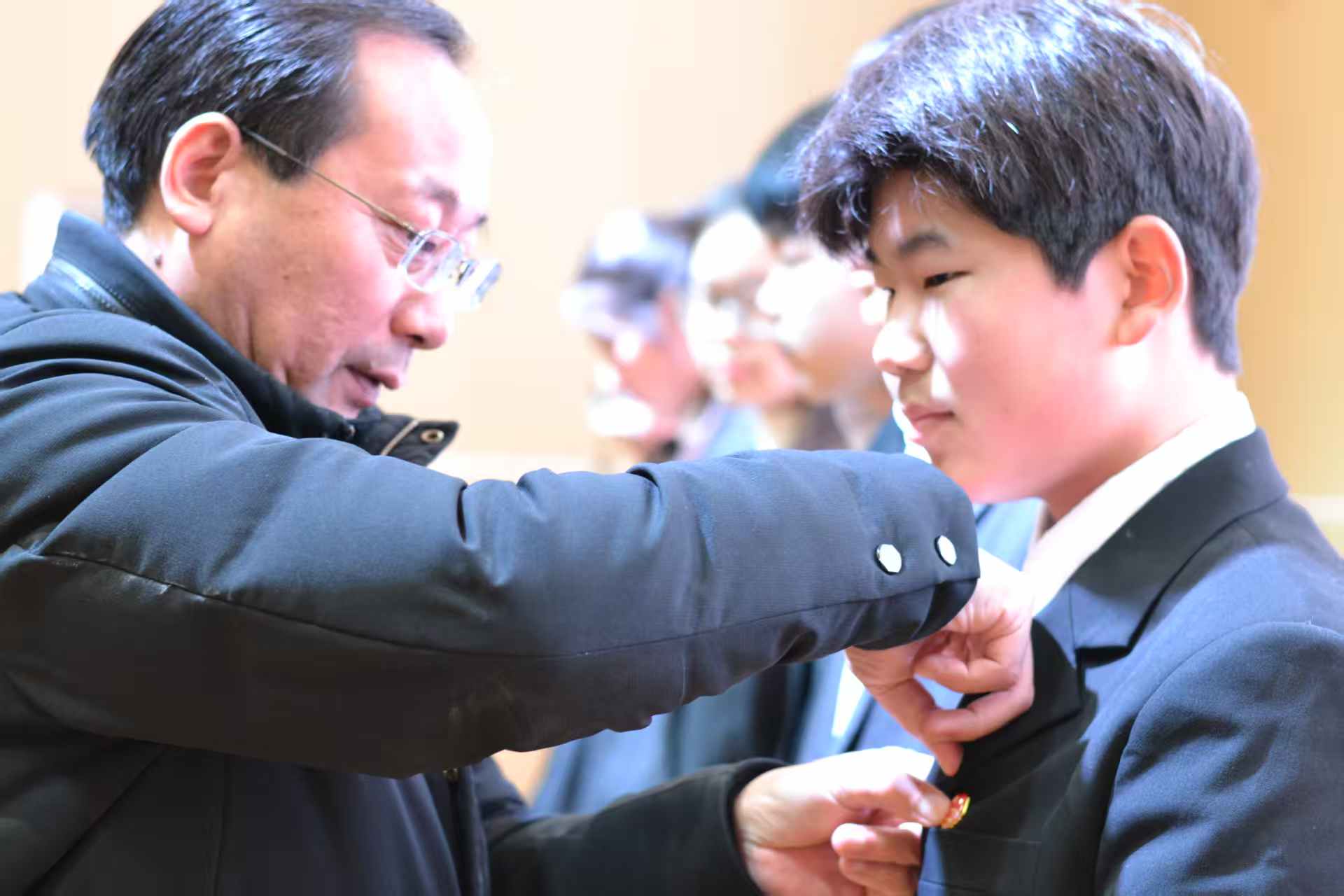 接下来,由孙华山同志、丁浩同志共同为新团体代表佩戴团徽,台下的新团员们互相佩戴。金色团徽在胸前闪耀,象征着责任与信仰的传递,互相佩戴团徽将入团仪式从传统的“身份赋予”转变为“精神唤醒”,真正实现“一枚团徽,双重成长”——这正是新时代共青团基层组织建设的创新方向。