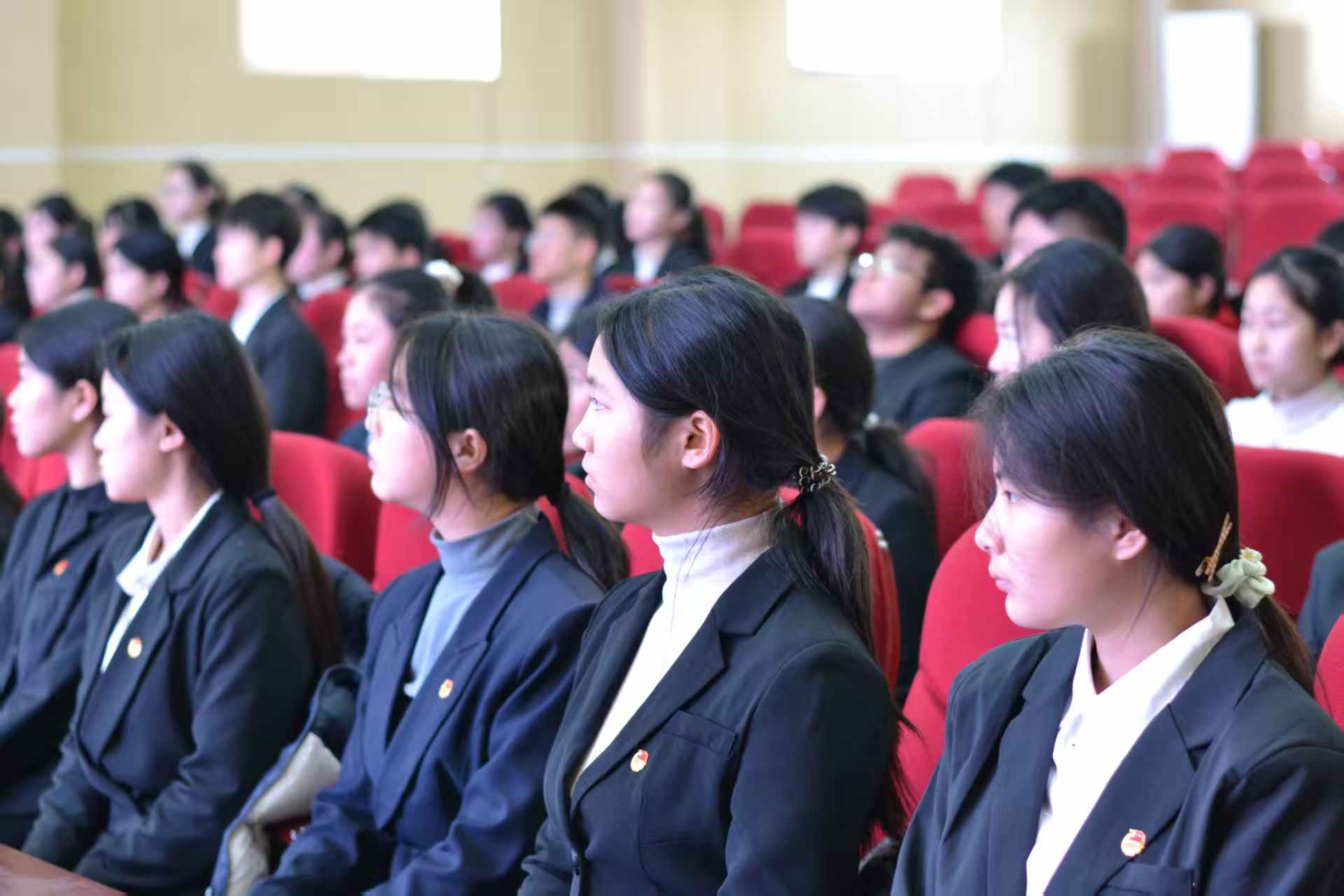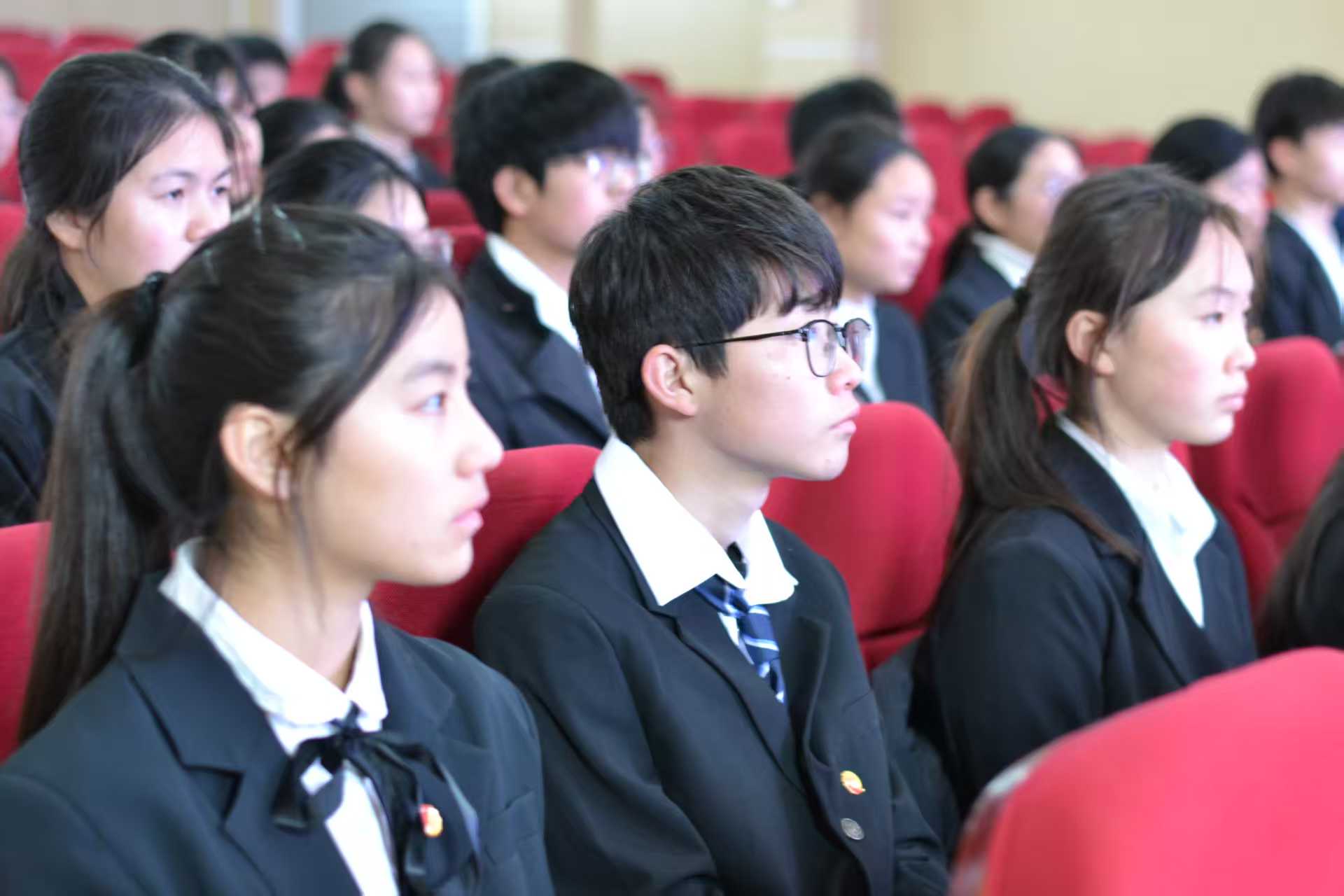 全体团员高唱《光荣啊,中国共青团》,青春的激情在歌声中飞扬。从戴上团徽的那一刻起,新的征程已经开启。